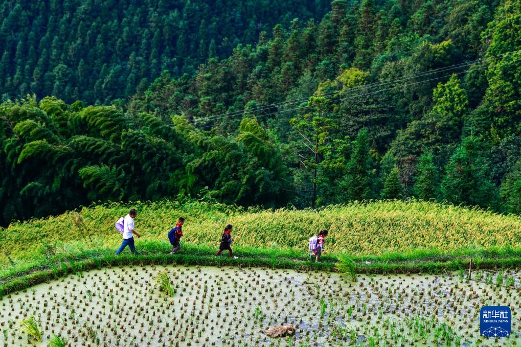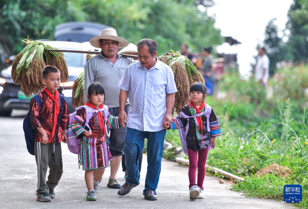 孟荣达(前排右二)护送路远的学生放学回家(9月5日摄)。