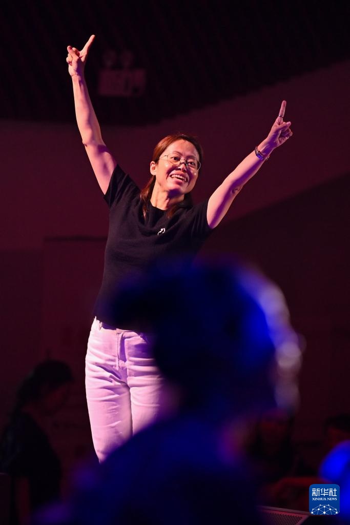 在太原市晋源区,赵静在舞台上通过手势指挥队员表演(9月2日摄)。