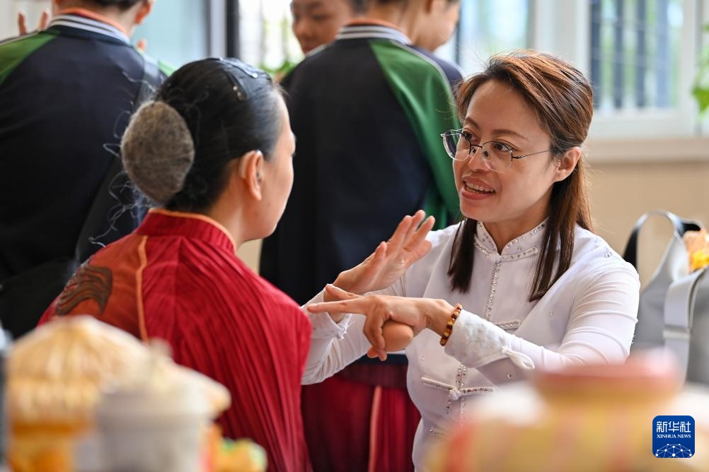 在太原市晋源区,赵静(右)通过手语与一名队员交流,缓解其上台演出前的紧张情绪(9月6日摄)。