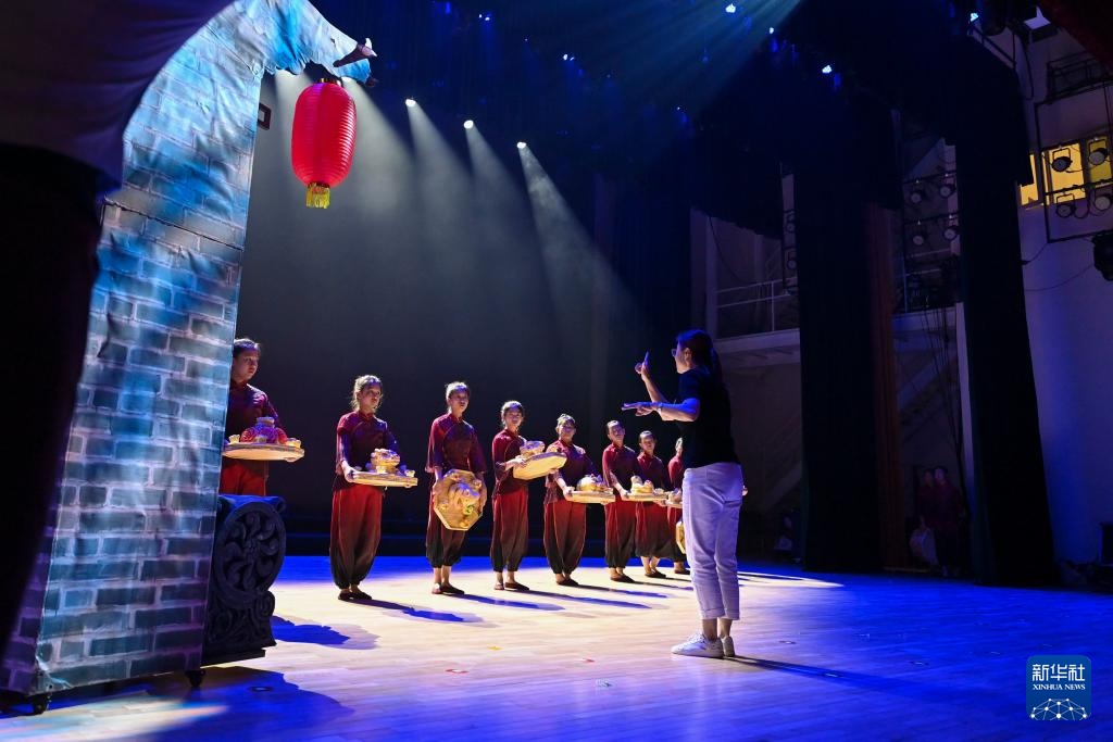 在太原市晋源区,赵静和队员们在舞台上沟通(9月2日摄)。
