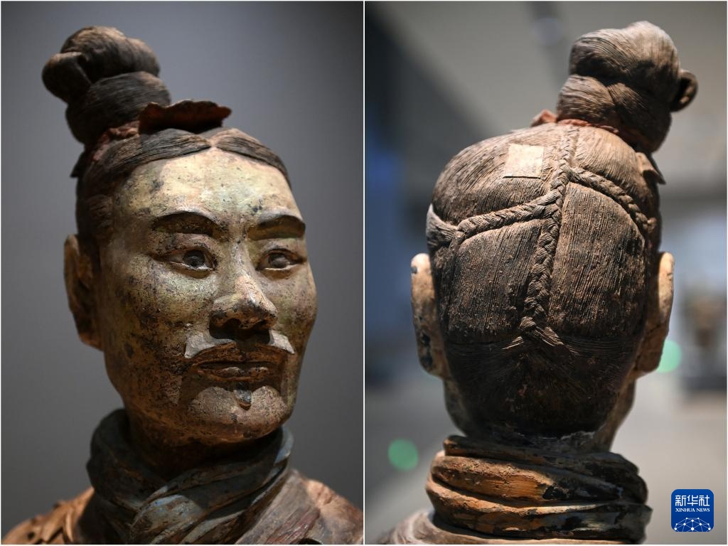 这是在秦始皇帝陵博物院展出的绿面跪射俑(正反面拼版照片,9月8日摄)。