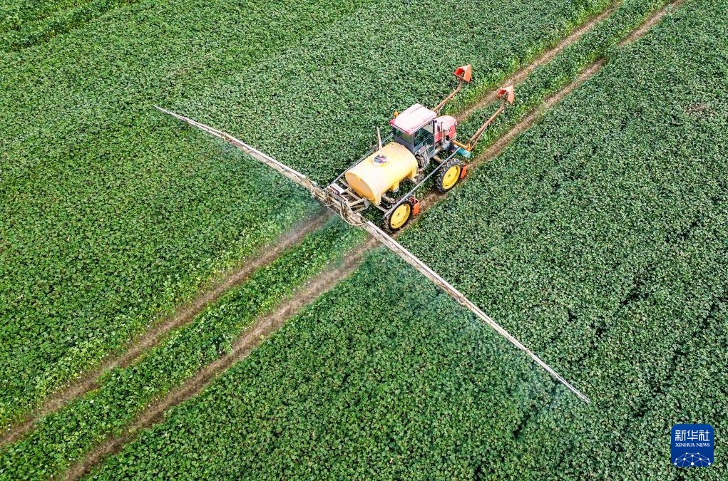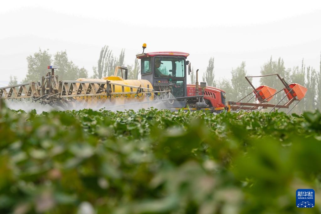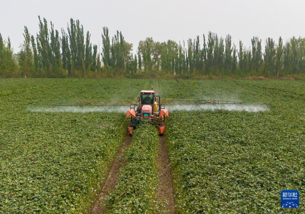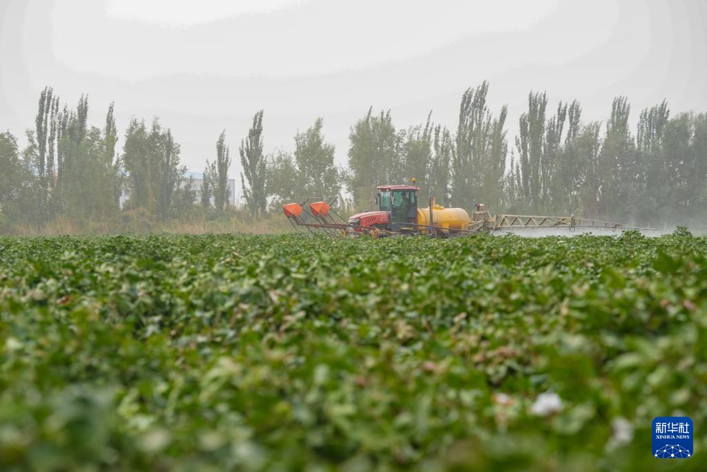 眼下,新疆生产建设兵团一师阿拉尔市种植的203万亩棉花长势良好,进入喷洒脱叶剂关键期。棉花种植户使用吊杆式喷雾机喷洒药液,以加快棉花吐絮和棉叶脱落。阿拉尔以种植塔河二号陆地棉为主,今年预计亩产470公斤,计划本月下旬开始机械化采收。