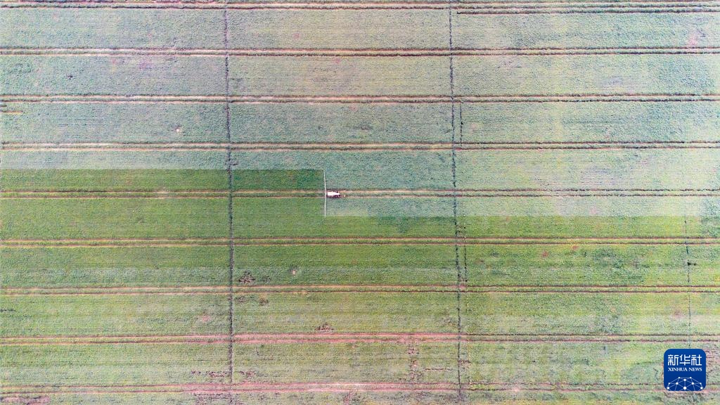 9月9日,阿拉尔市花桥镇棉花种植户驾驶农机喷洒脱叶剂(无人机照片)。
