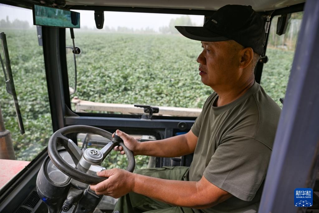 9月9日,阿拉尔市花桥镇棉花种植户驾驶农机喷洒脱叶剂。