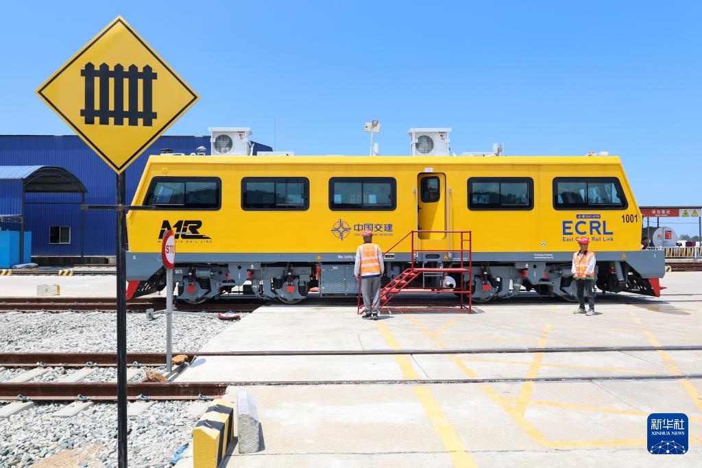 5月6日,在马来西亚彭亨州马东铁项目的铺轨现场,工人们检查铺轨机。