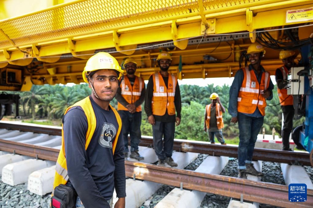 5月6日,在马来西亚彭亨州,马东铁项目的工人正在进行铺轨工作。