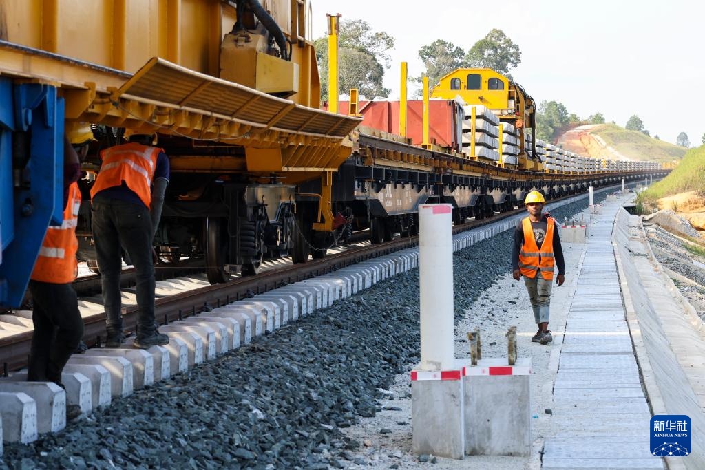这是5月6日在马来西亚彭亨州航拍的马东铁项目的铺轨现场。