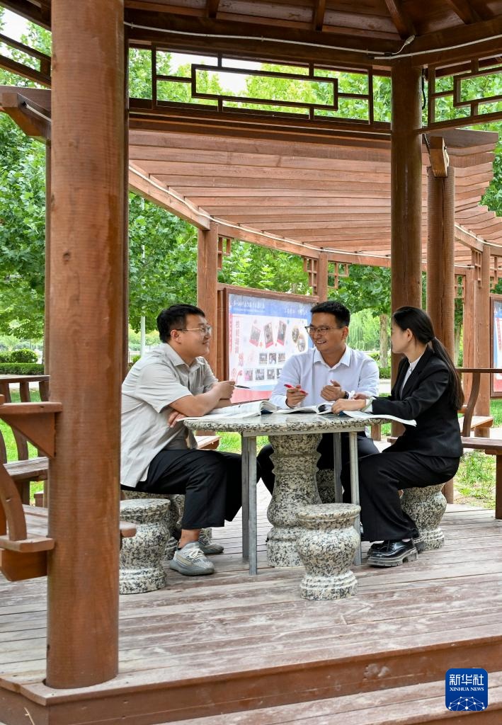 9月10日,在阿拉尔职业技术学校,李斌傲(中)和王龙飞(左)、郝梦洁(右)分享教学经验。王龙飞、郝梦洁是本校教师,是李斌傲的徒弟。