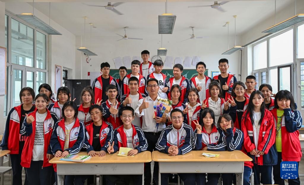 这是9月10日在阿拉尔职业技术学校拍摄的李斌傲老师和23级电商班的学生。