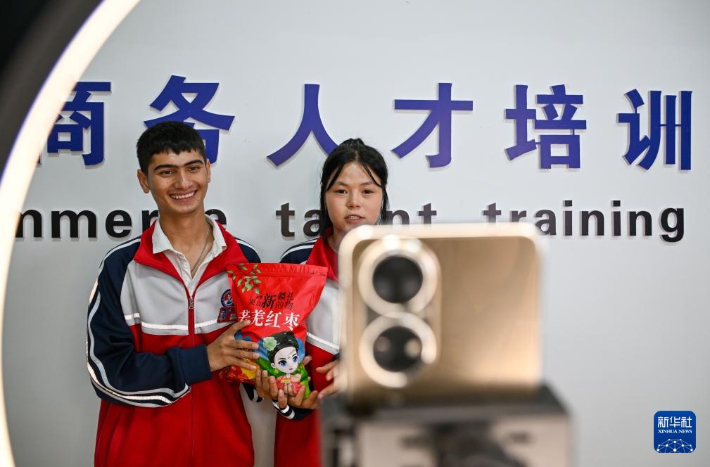 9月10日,在阿拉尔职业技术学校,李斌傲的学生在实训室模拟电商直播带货。