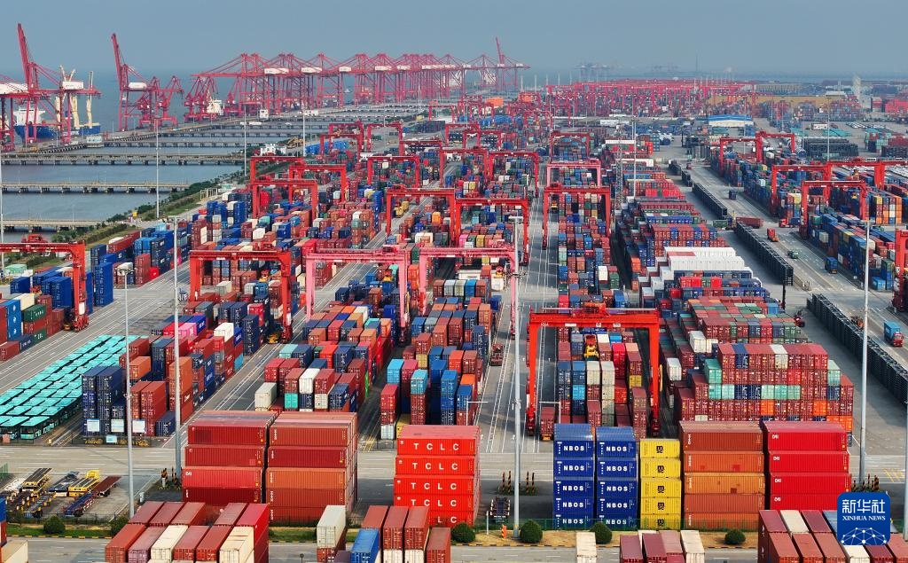 江苏省苏州港太仓港区集装箱码头,集装箱吞吐作业繁忙(无人机照片,8月10日摄)。