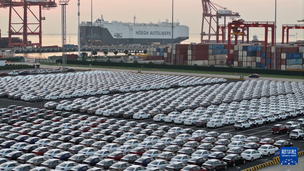 汽车运输船“礼诺极光”轮靠泊江苏省苏州港太仓港区,即将装载2336辆汽车首航欧洲(无人机照片,8月23日摄)。
