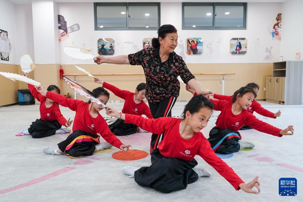 在江苏苏州昆山市石牌中心小学校“习美楼”的训练房内,昆曲老师吴美玉(中)带着小昆班的学员们进行扇舞训练(5月30日摄)。