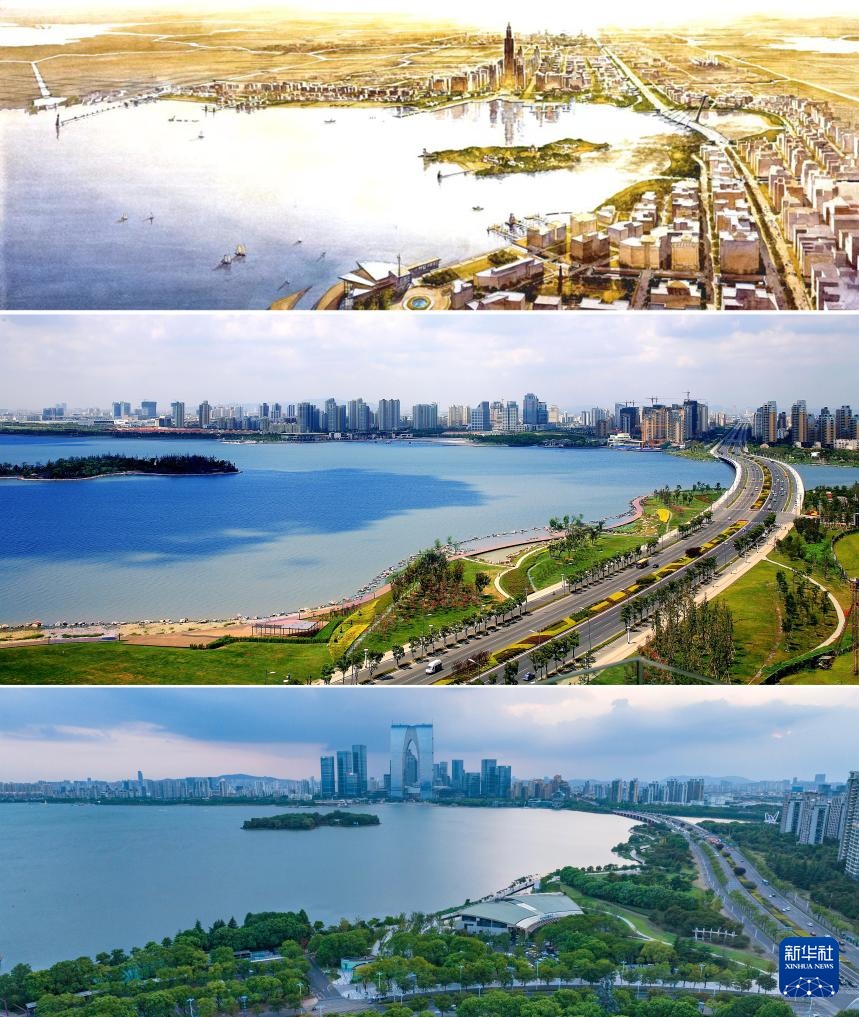 这是一张拼版照片,上图为1994年苏州工业园区手绘规划图(新华社发);中图为2012年拍摄的苏州工业园区照片(新华社发);下图为2024年8月29日拍摄的苏州工业园区(无人机照片,新华社记者李博摄)。