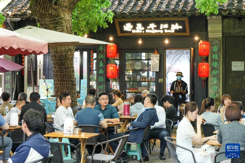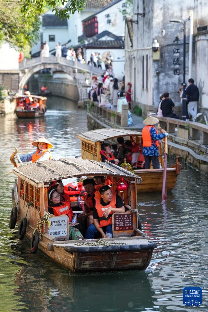 游客在苏州平江历史文化街区休闲游玩(4月18日摄)。