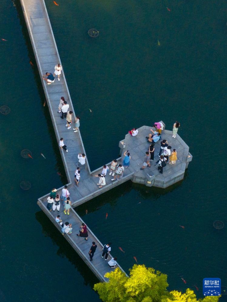 游客在苏州博物馆内的景观曲桥参观游玩(8月29日摄)。
