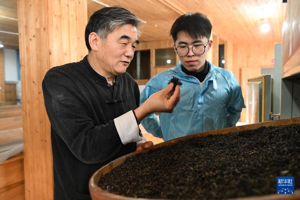 在苏州市吴中区东山镇,苏州市碧螺春制作技艺非物质文化遗产代表性传承人严介龙在传授徒弟红茶制作要领(4月11日摄)。