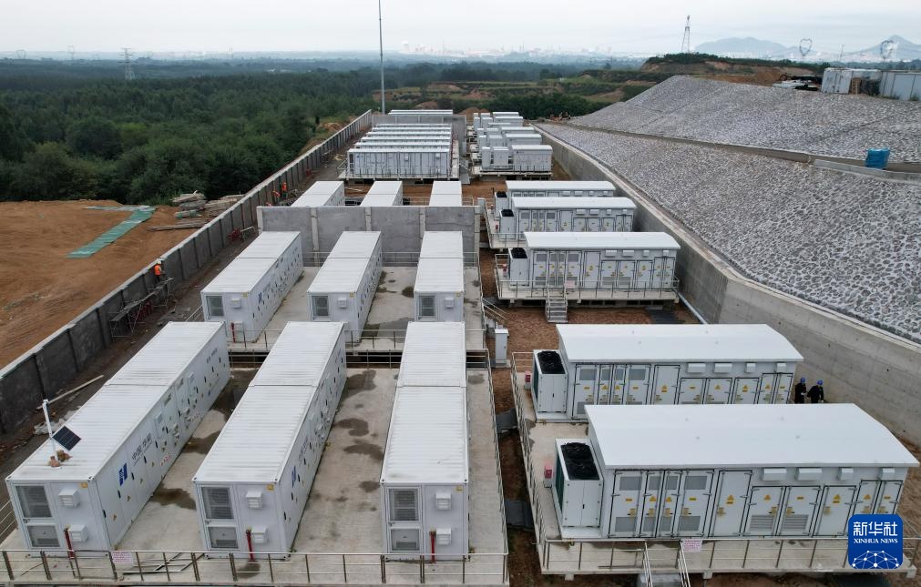 9月10日,工人在位于河北省平山县的西柏坡百兆瓦级新型电力系统示范工程建设工地施工(无人机照片)。