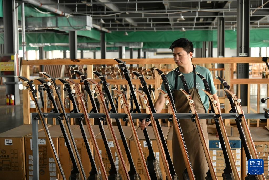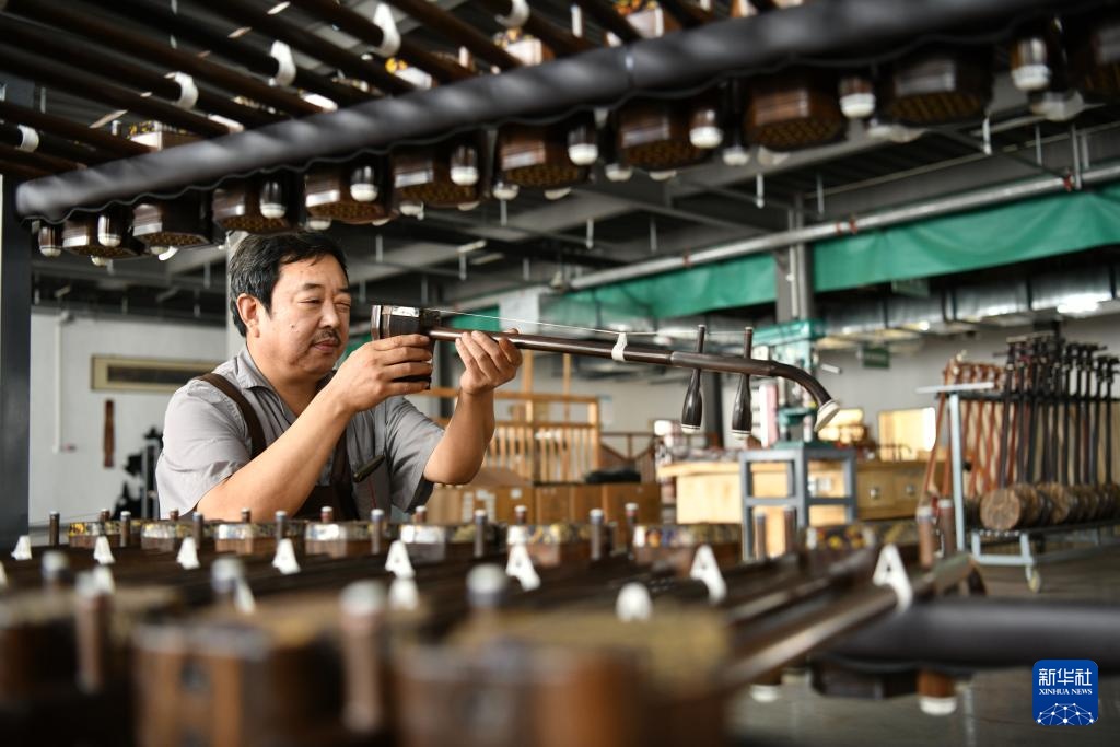 9月11日,工人在河北省肃宁县乐海乐器有限责任公司生产车间内制作二胡。