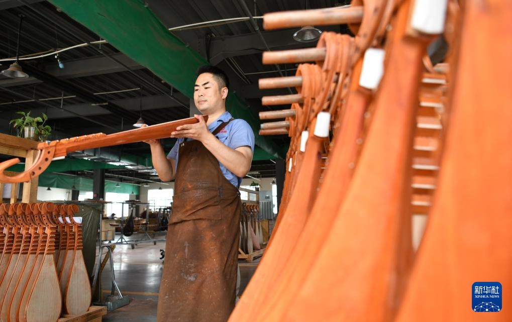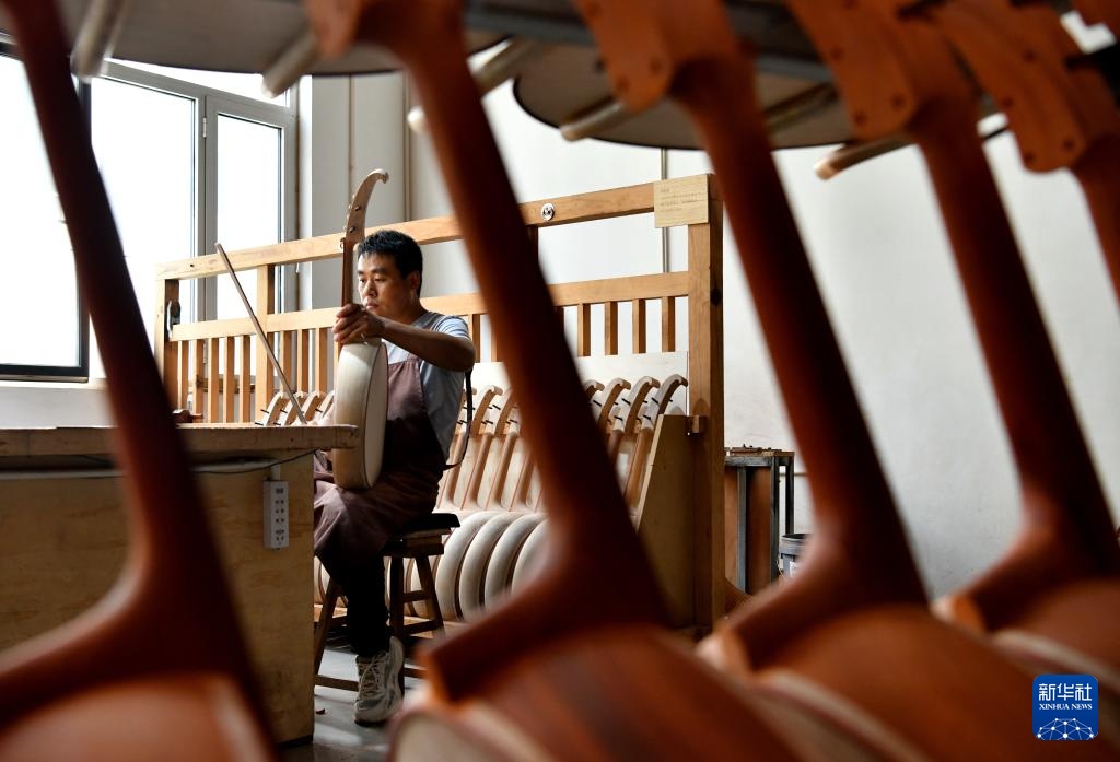 9月11日,工人在河北省肃宁县乐海乐器有限责任公司生产车间内制作阮。