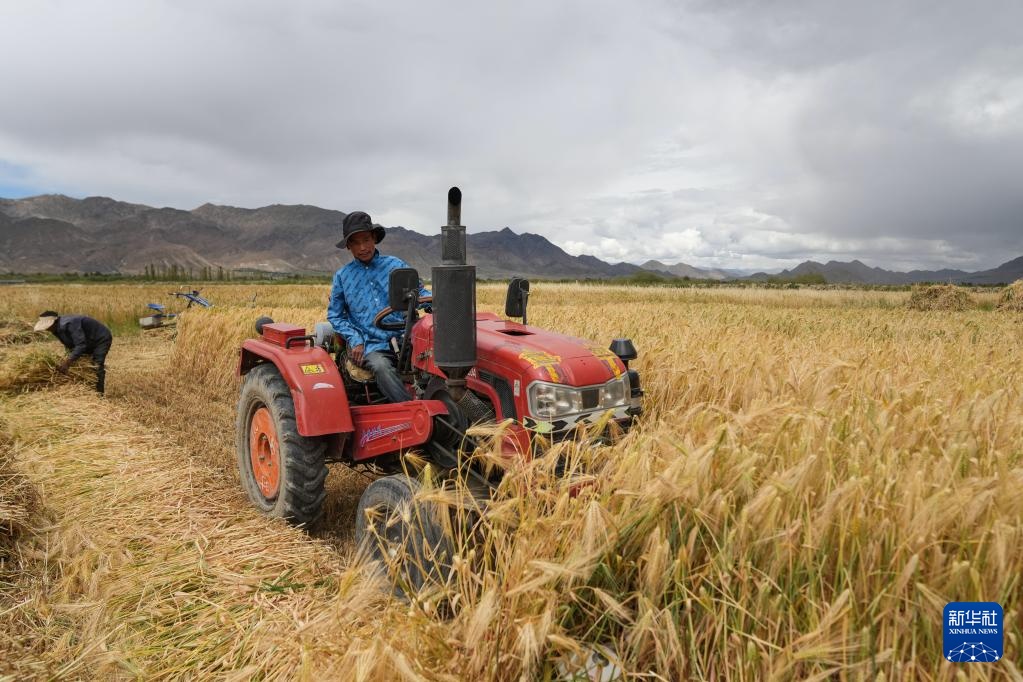 9月10日,西藏日喀则市白朗县巴扎乡农民操作农机收获青稞。
