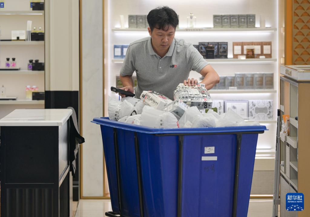 9月11日,工作人员在中免集团海口日月广场免税店整理货物。