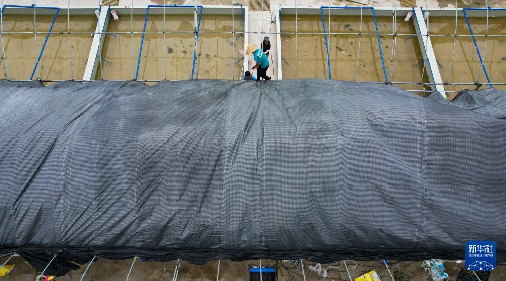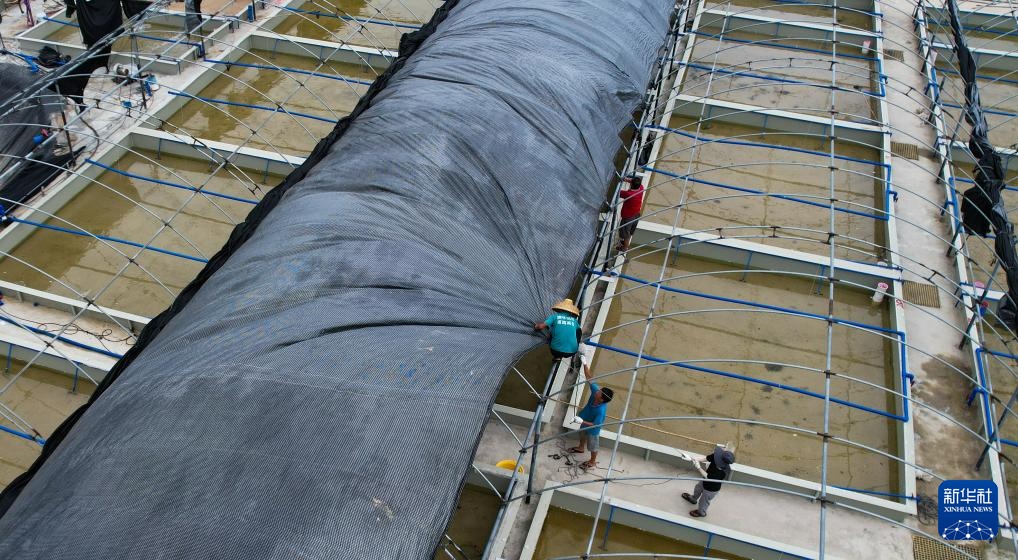 9月10日,工作人员在位于海南省文昌市翁田镇的海兴农翁田虾苗场重新铺设顶棚(无人机照片)。