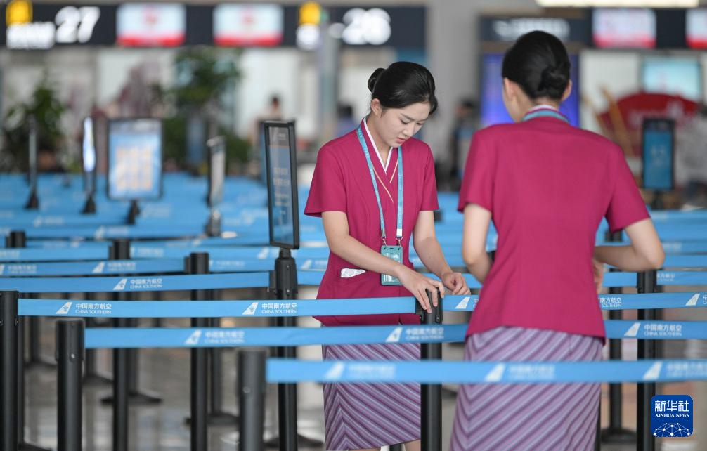 9月11日,南方航空工作人员在海口美兰国际机场2号航站楼布设旅客值机通道。该航站楼目前已恢复使用。