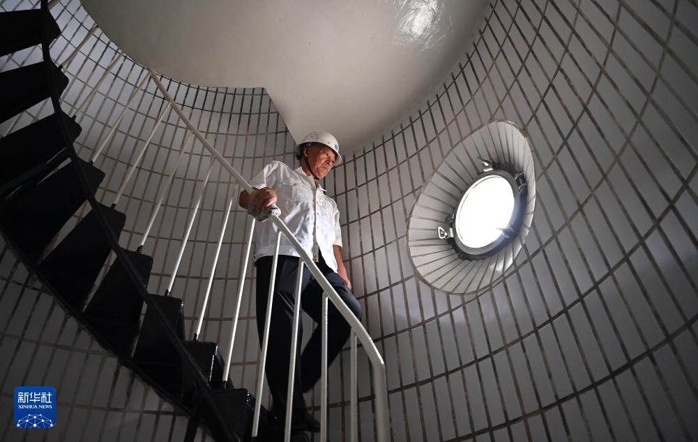 9月10日,王洪安在灯塔顶部检查灯器工作状态后,从七层楼高的旋转楼梯走下。