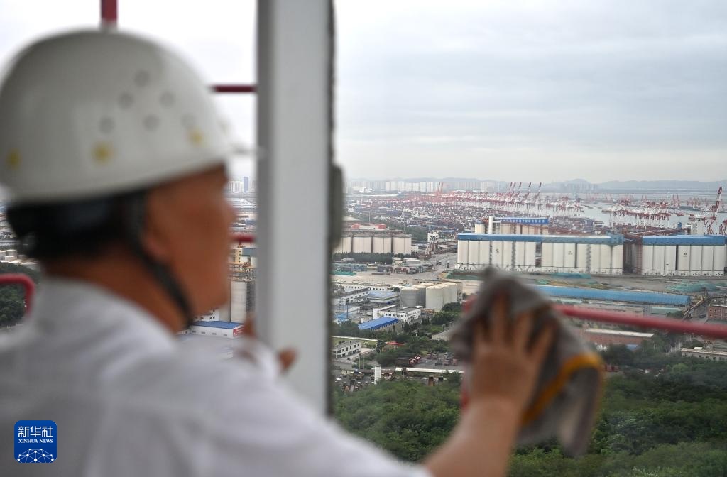 9月10日,王洪安在擦拭台子山灯塔顶部灯器室玻璃上的灰尘,远处是营口港。