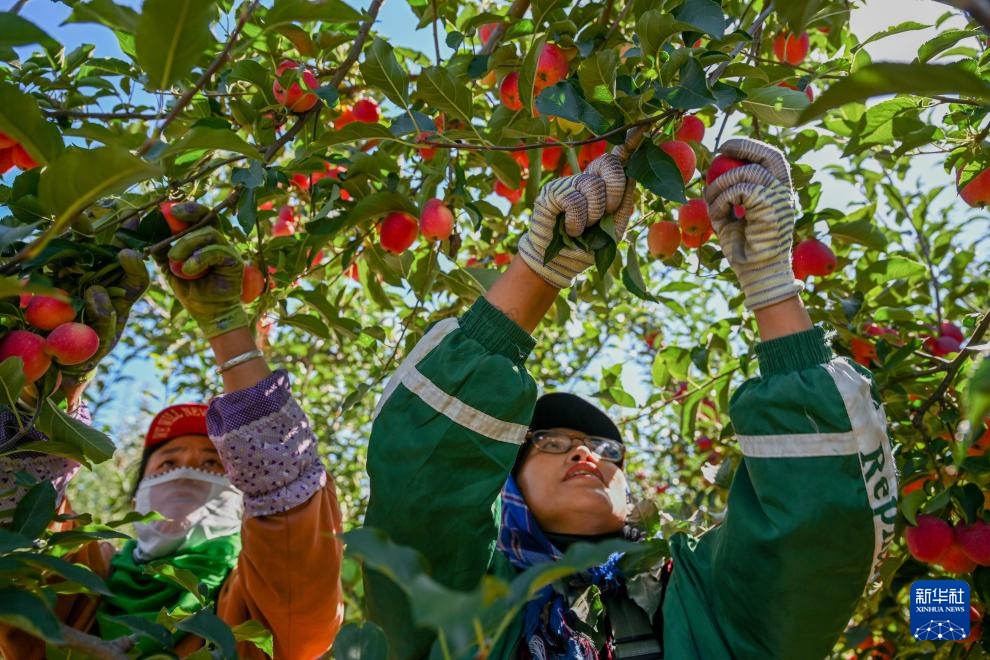 9月12日,在通辽市科尔沁左翼中旗希伯花镇希伯花嘎查,果农在采摘锦绣海棠果。