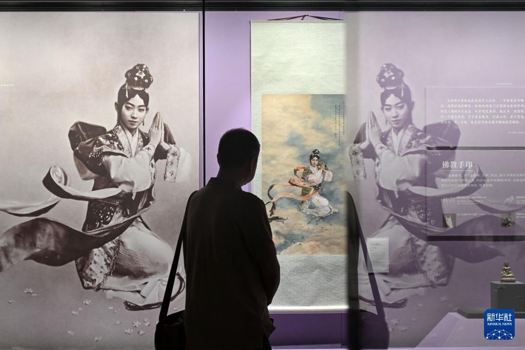 9月12日,观众参观梅兰芳在京剧《天女散花》中的剧照(左)和徐悲鸿画作《天女散花》(复制品)。