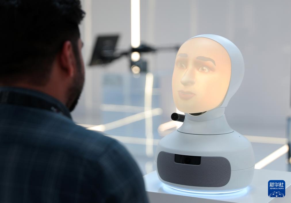 9月12日,在沙特阿拉伯首都利雅得举行的第三届全球人工智能峰会上,一名参会者与“对话机器人”交流。