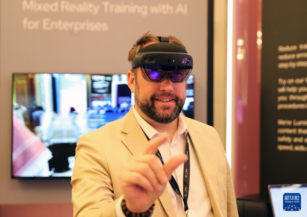 9月10日,在沙特阿拉伯首都利雅得举行的第三届全球人工智能峰会上,工作人员操控一款可用于企业培训的虚拟现实眼镜。