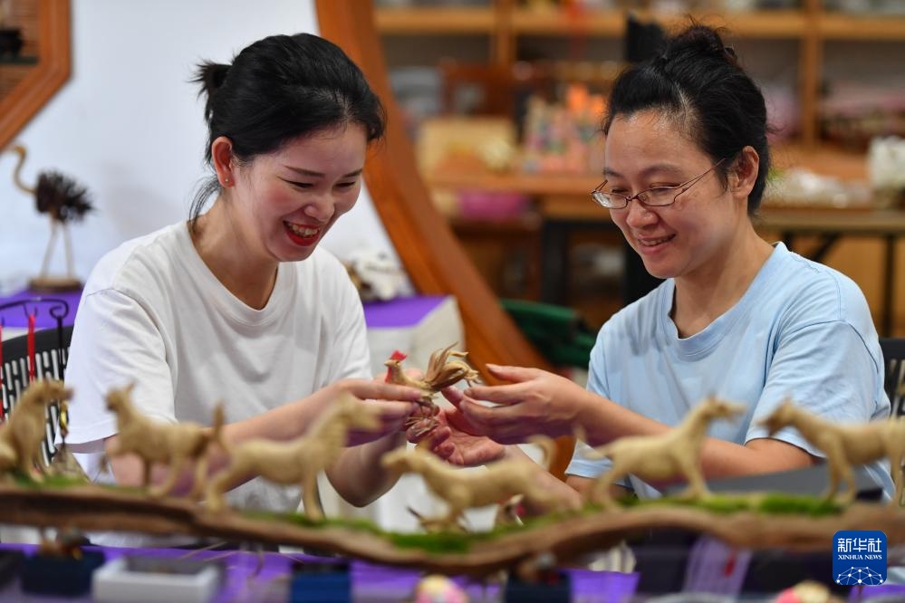 在长沙铜官窑国风乐园,长沙棕叶编非遗传承人周佳霖(右)向游客展示制作好的棕叶编作品(9月11日摄)。