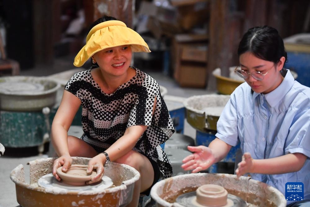 在长沙铜官老街,游客体验陶瓷制作(9月11日摄)。