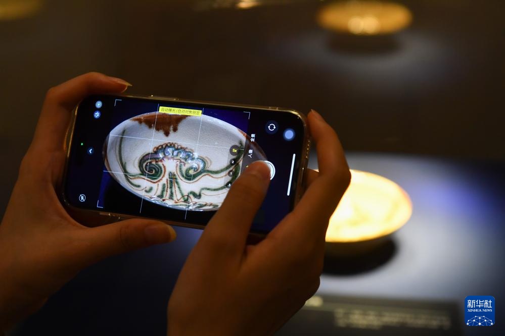 在长沙铜官窑博物馆,游客在拍摄“黑石号”沉船出水的长沙窑青釉褐绿彩阿拉伯文碗(9月11日摄)。