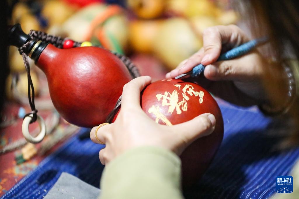 9月13日,在兰州市雁滩公园,甘肃省非物质文化遗产兰州刻葫芦传承人阮熙越展示雕刻葫芦技艺。