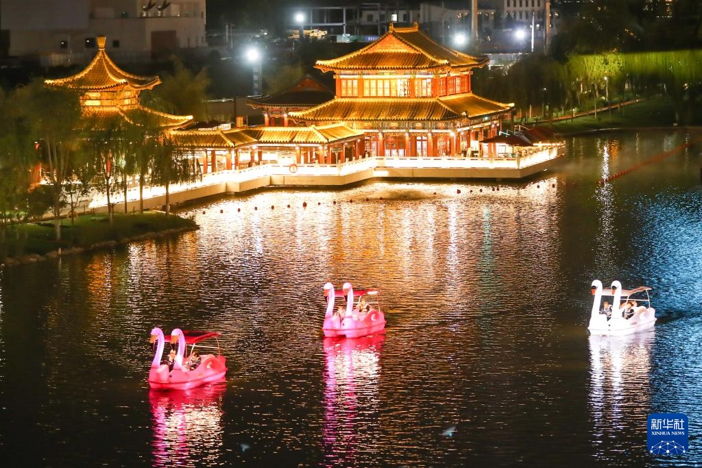 9月13日,游客在兰州市雁滩公园内的湖面上乘船夜游。