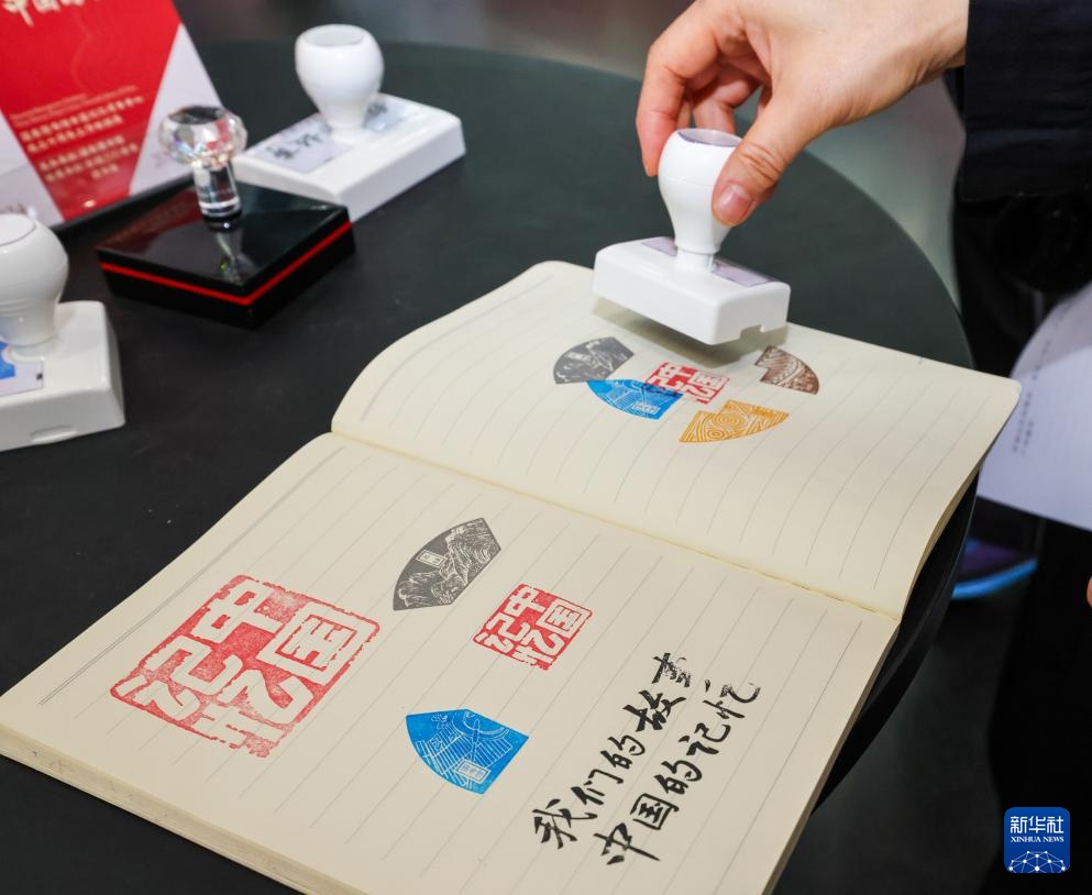 9月14日,在北京国家图书馆,参观者在回顾展上盖纪念章。