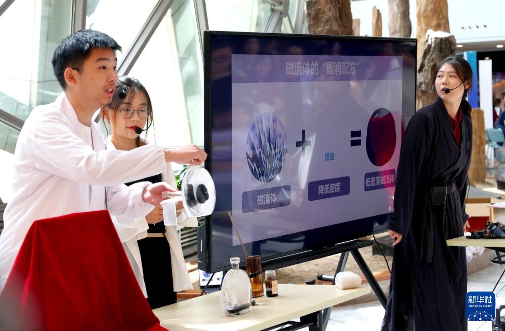 9月14日,来自上海交通大学的科普工作人员在科普秀活动上向参观者演示磁铁对磁流体产生的影响。
