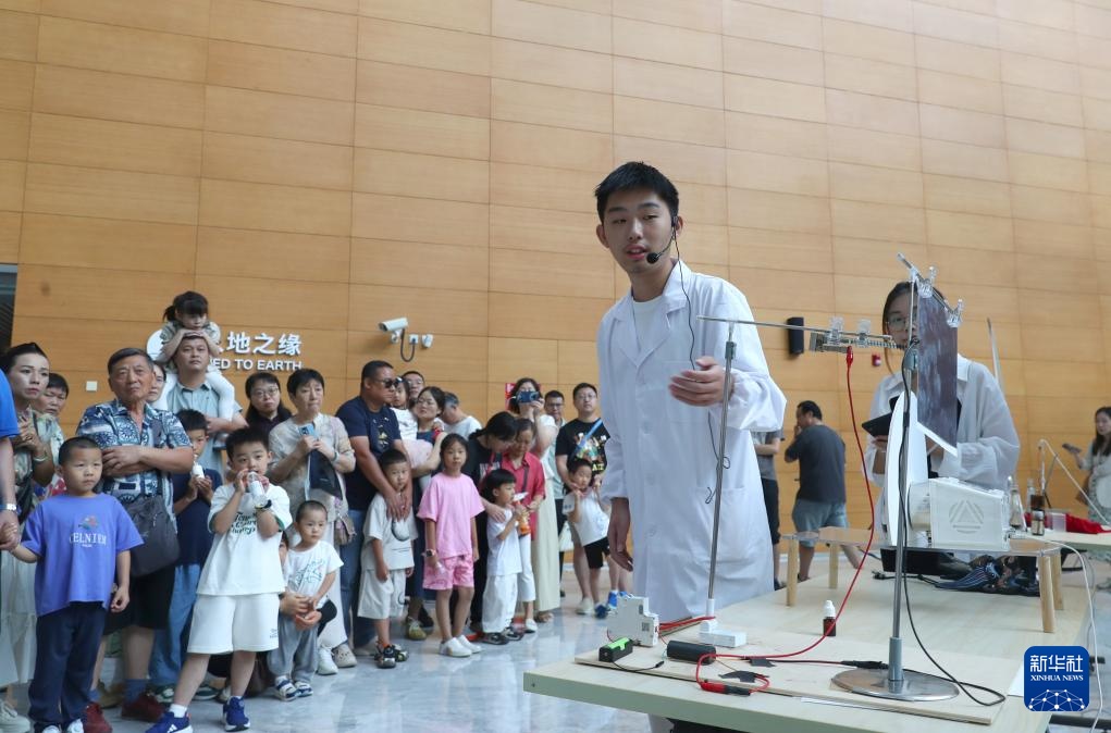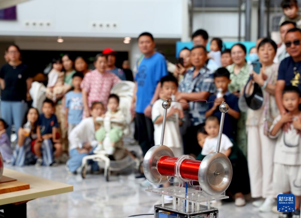 9月14日,参观者在科普秀活动上观看上海交通大学师生带来的磁流体与电磁力科学实验展演。