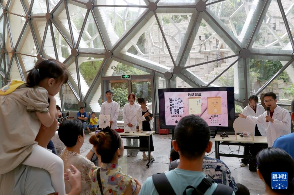 9月14日,参观者在科普秀活动上观看特斯拉线圈的放电演示。