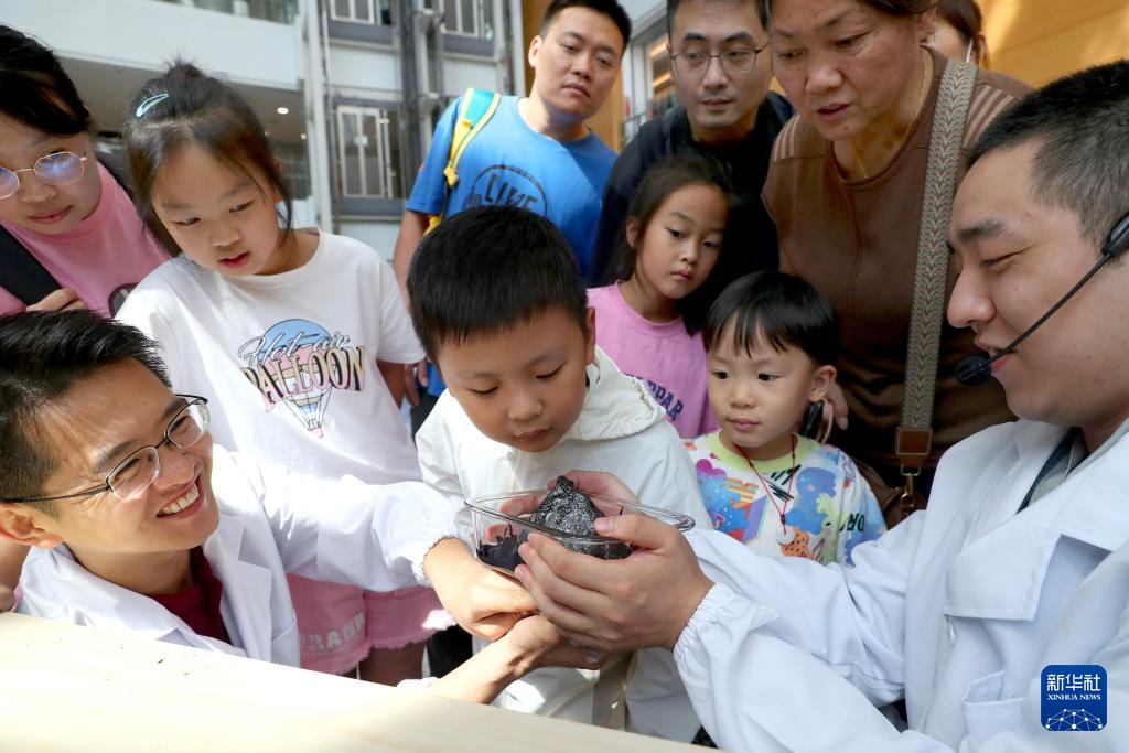 9月14日,小朋友在科普秀活动上近距离观察磁流体磁力实验效果。