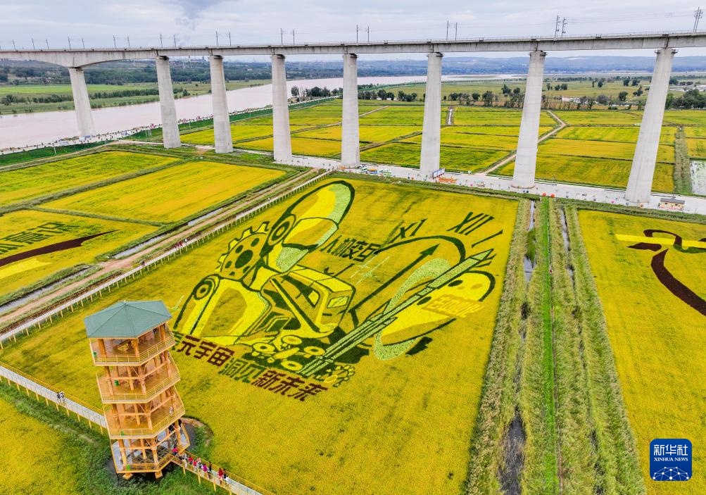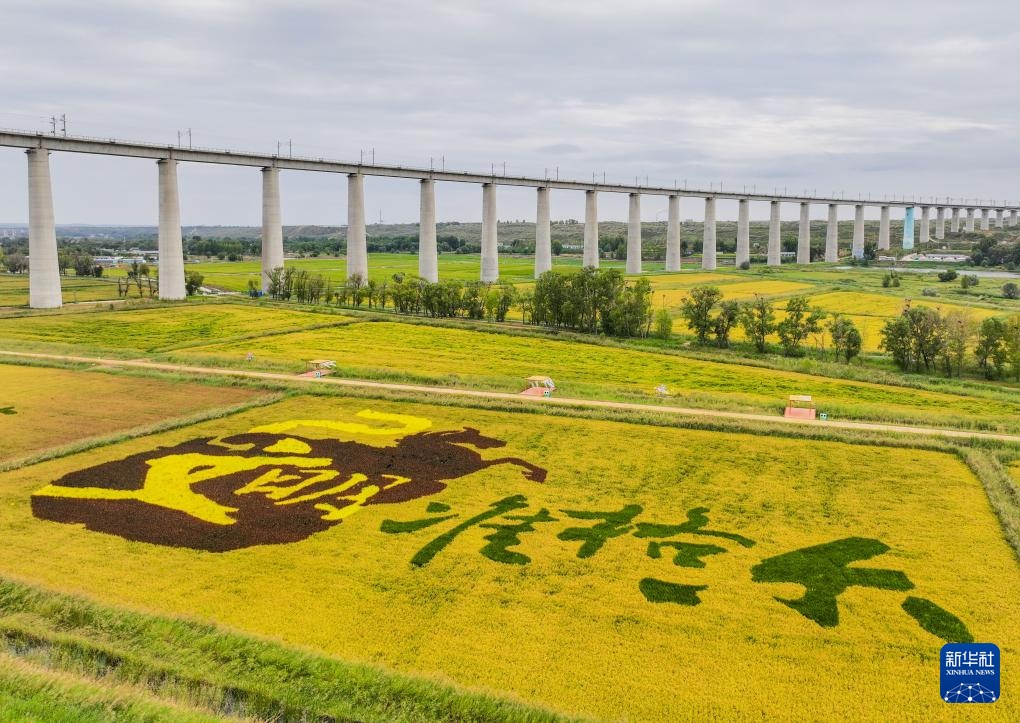 这是9月14日在准格尔旗大路镇小滩子村拍摄的稻田画(无人机照片)。