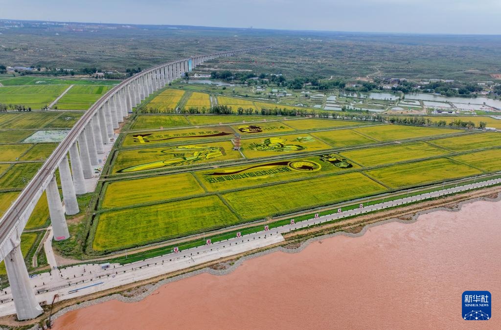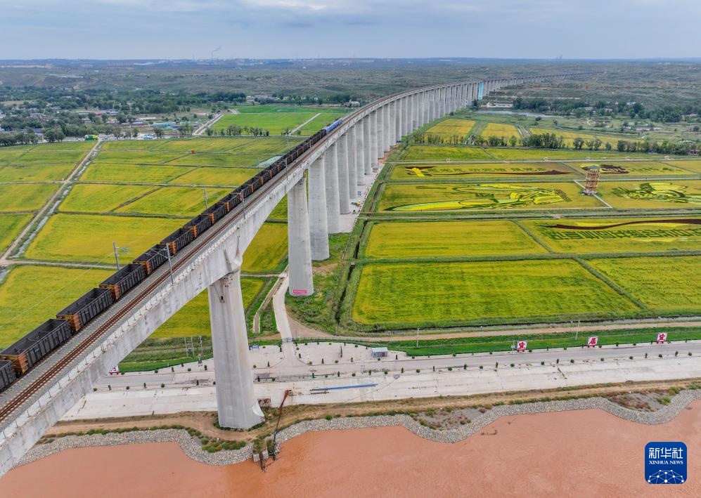 9月14日,在准格尔旗大路镇小滩子村,一列火车驶过黄河和稻田(无人机照片)。