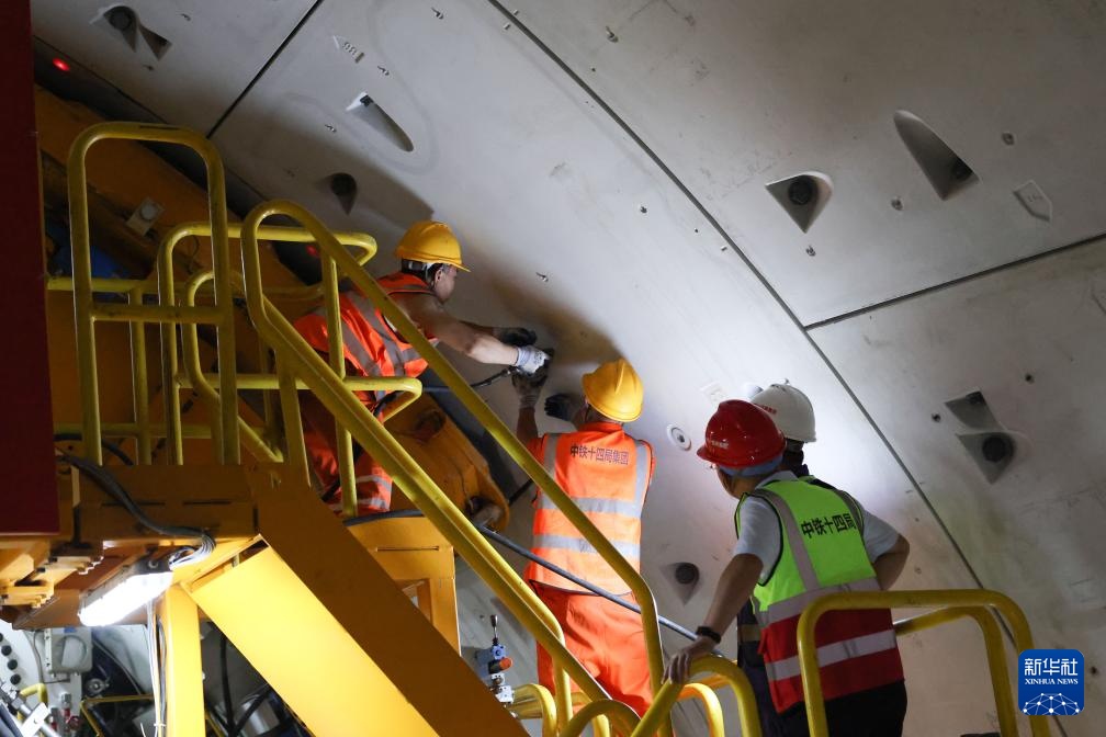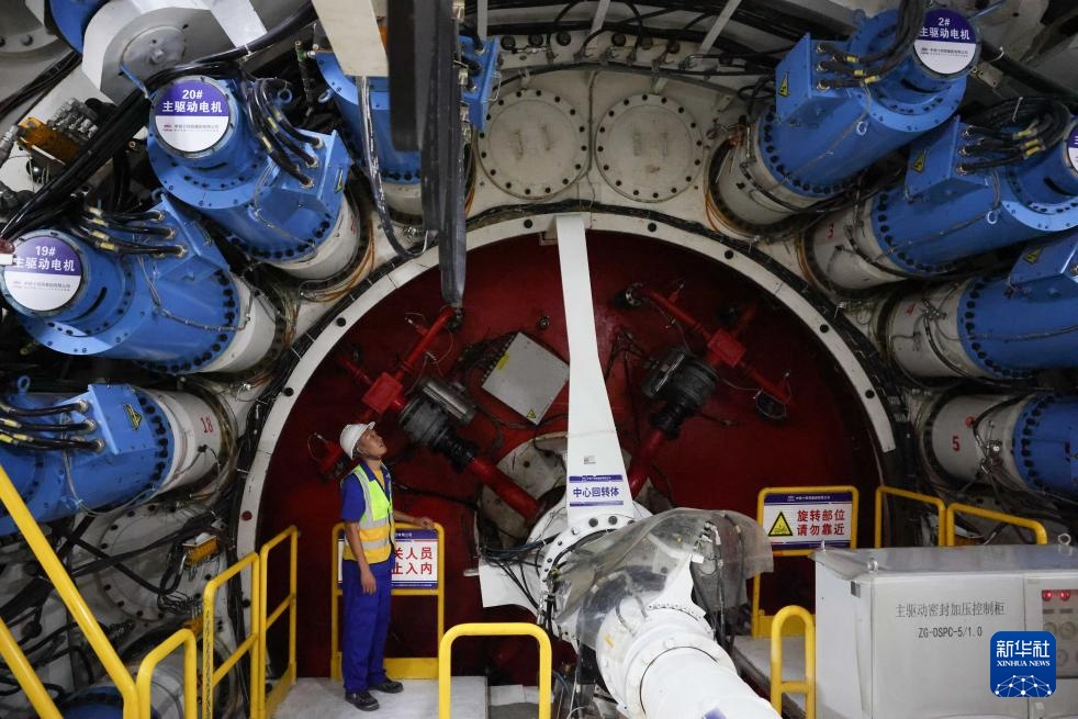 9月14日,中铁十四局技术人员在甬舟铁路金塘海底隧道“甬舟号”盾构机内作业。