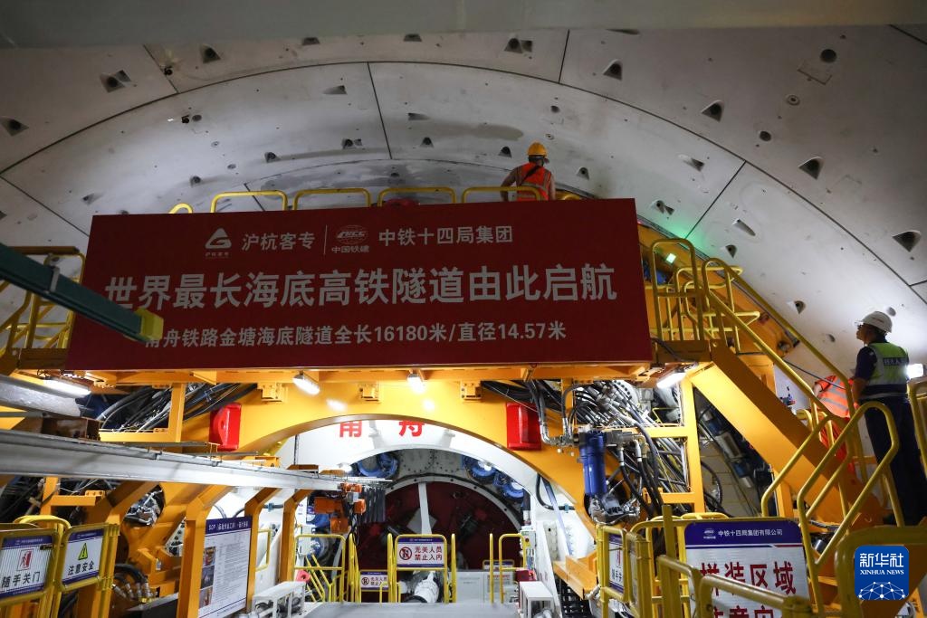9月14日,中铁十四局技术人员在甬舟铁路金塘海底隧道“甬舟号”盾构机内进行管片拼装作业。