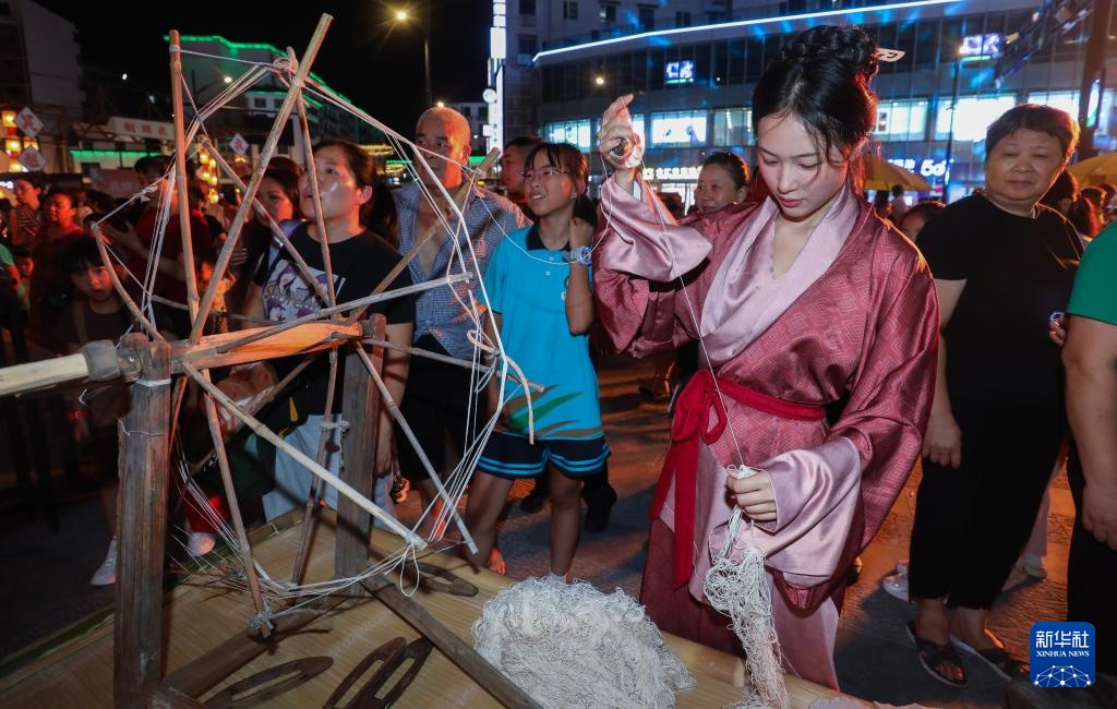 9月14日在杭州临安衣锦街国风市集上拍摄传统纺纱技艺展示。