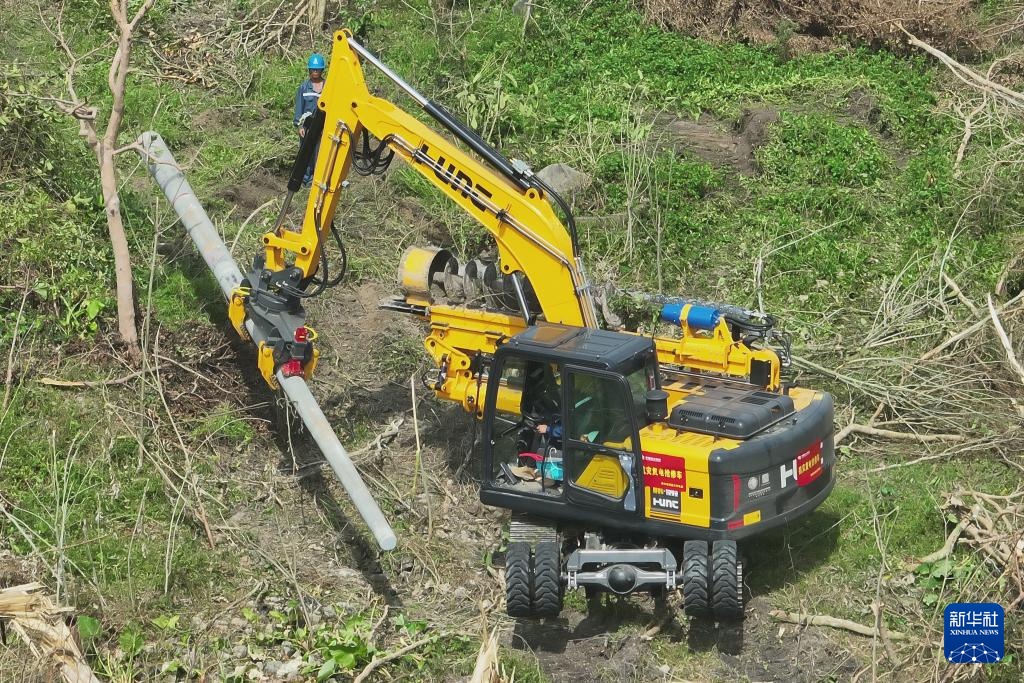 9月14日,在海南文昌龙楼镇,南方电网贵州遵义供电局的工作人员操作配网钻孔立杆一体机立电线杆。